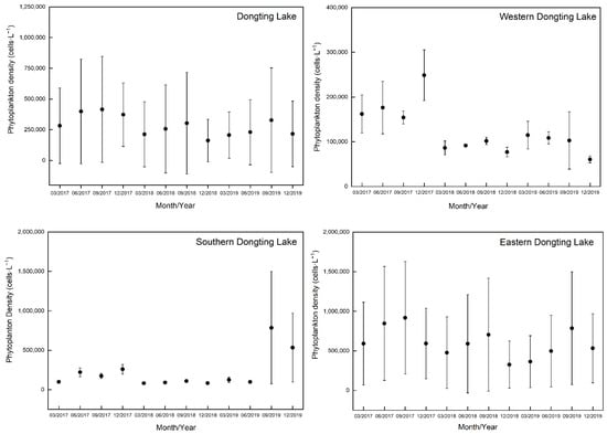 Our data indicated that the phytoplankton density in Dongting Lake decreased obviously from 2017 to 2019, especially in Western Dongting Lake, which was closely related to the improvement of water quality in Dongting Lake in recent years. For example, the concentration of DO increased by 6.91%, whereas the concentrations of BOD5, CODCr, NH4+–N, TN, and TP decreased by 17.5%, 13.0%, 33.8%, 7.6%, and 13.3%, respectively. In addition, the phytoplankton density in Eastern Dongting Lake was significantly higher compared with Western and Southern Dongting Lake. Such difference could be explained by the fact that the Big-small West Lake site of Eastern Dongting Lake was in the backwater area, with a significantly lower water velocity compared with other areas, resulting in the significantly higher phytoplankton density of this site compared with other sites.