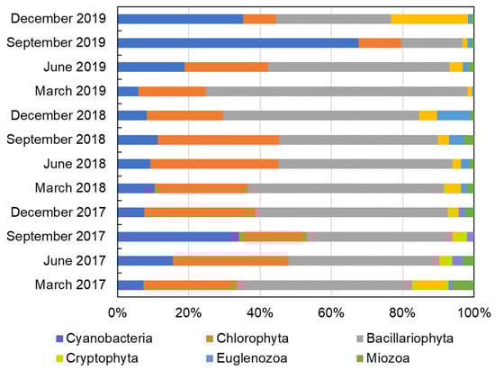 In the present study, we identified 67 genera of phytoplankton belonging to six phyla in Dongting Lake (Table S1). Figure 2 shows that the density of phytoplankton gradually increased from spring to summer (March, June, and September), and it significantly decreased from autumn to winter (December). The density of phytoplankton was higher in Eastern Dongting Lake compared with Western and Southern Dongting Lake. The mean phytoplankton density reached 4.15 × 105 cells·L−1 in September 2017, whereas it was only 1.62 × 105 cells·L−1 in December 2018. Bacillariophyta and Chlorophyta were the most abundant taxonomic groups from March 2017 to June 2019, whereas Cyanobacteria became the dominant group in the summer, with a peak value of 3.33 × 106 cells·L−1 in September 2019. In addition, Cryptophyta was the dominant group only in the winter (December) of 2019 (Figure 3).