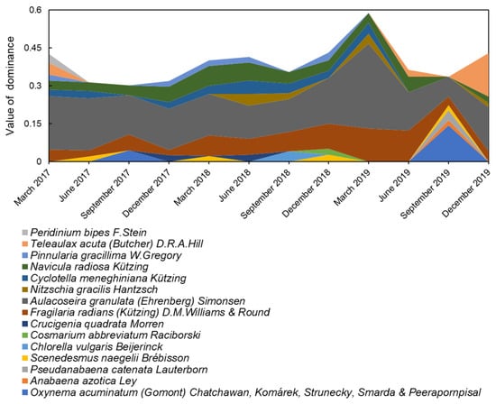 There were 15 dominant species that belonged to five phyla from March 2017 to December 2019, with the dominance ranging from 0.020 to 0.143, 0.021 to 0.041, 0.020 to 0.337, 0.020 to 0.048, and 0.020 to 0.036 in Cyanobacteria, Chlorophyta, Bacillariophyta, Cryptophyta, and Miozoa, respectively. Fragilaria radians (Kützing) D.M.Williams & Round and Aulacoseira granulata (Ehrenberg) Simonsen were the dominant populations in all seasons, and the dominant area of Aulacoseira granulata (Ehrenberg) Simonsen could reach a peak of 0.337 in March 2019. In addition, Oxynema acuminatum (Gomont) Chatchawan, Komárek, Strunecky, Smarda & Peerapornpisal, Anabaena azotica Ley, and Pseudanabaena catenata Lauterborn became dominant species in September 2019 (Figure 4).