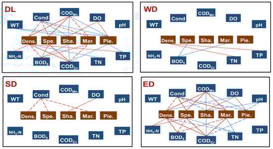 In DL, the Pearson analysis indicated that the phytoplankton density was positively related to Cond (R = 0.486, p < 0.05), CODMn (R = 0.857, p < 0.01), BOD5 (R = 0.581, p < 0.05), CODCr (R = 0.849, p < 0.01), NH4+–N (R = 0.202, p < 0.05), and TP (R = 0.270, p < 0.05), whereas it was negatively related to TN (R = −0.168, p < 0.05). Moreover, the phytoplankton species was positively related to Cond (R = 0.521, p < 0.05), CODMn (R = 0.719, p < 0.01), BOD5 (R = 0.378, p < 0.05), and CODCr (R = 0.717, p < 0.01). In addition, the phytoplankton diversity was negatively related to WT (R = −0.161, p < 0.05), Cond (R = −0.181, p < 0.05), CODMn (R = −0.226, p < 0.05), BOD5 (R = −0.159, p < 0.05), and CODCr (R = −0.281, p < 0.05), whereas it was positively related to DO (R = 0.238, p < 0.05). The phytoplankton richness was positively related to Cond (R = 0.477, p < 0.05), CODMn (R = 0.622, p < 0.05), BOD5 (R = 0.284, p < 0.05), and CODCr (R = 0.615, p < 0.05), and the phytoplankton evenness was negatively related to WT (R = −0.167, p < 0.05), Cond (R = −0.243, p < 0.05), CODMn (R = −0.291, p < 0.05), CODCr (R = −0.335, p < 0.05), and TP (R = −0.157, p < 0.05), whereas it was positively related to DO (R = 0.226, p < 0.05) (Figure 5; Table S2; Figures S1, S3–S10).