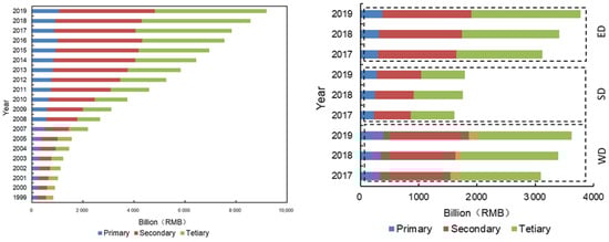 Economic development trend of Dongting Lake (left) and industrial structure composition in different areas of Dongting Lake during 2017–2019 (right). The primary output is agriculture, the secondary output is industry, and the tertiary output is service industry; WD: Western Dongting Lake; SD: Southern Dongting Lake; ED: Eastern Dongting Lake.