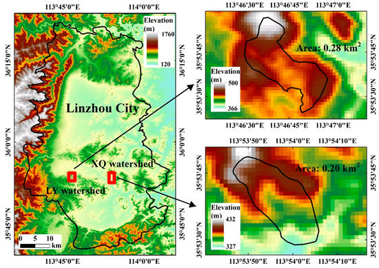 The study area consists of two small watersheds, one with an area of 0.2 km2 in Xingquan (XQ) watershed (35.89° N, 113.90° E) and another with an area of 0.28 km2 in Liyuan (LY) watershed (35.89° N, 113.78° E), which are located in Linzhou city, Northwest Henan Province (Figure 1). The climate in Linzhou is a warm temperate sub-humid continental monsoon, with an average annual temperature of 12.8 °C and an average annual precipitation of 635.5 mm. The rainfall is unevenly distributed, and most of the rainfalls fall between July and September and is dominated by precipitations. It is located in a rocky mountainous area, which is prone to soil erosion under extreme precipitation. In order to control the serious soil erosion in this area, a series of soil and water conservation measures have been adopted, including conversion of farmland to forest and grass, terracing and construction of check dams. The total area of soil and water conservation in Linzhou City is 1198.64 km2, and the area of soil and water losses has been reduced from 1800 km2 to 601.36 km2.