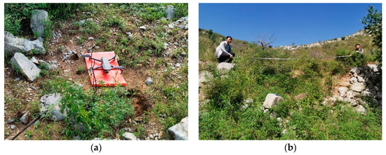 Field data were collected between the 7th and 11th of September 2021, affected by the COVID-19 in Henan Province. The field measurement of soil erosion is mainly divided into two parts: 1. Using the UVA to take aerial photos of two small watersheds, DOM and DSM data with a resolution of 0.05 m were obtained, and ArcGIS software was used to interpret the data captured. The content to be interpreted were the width of the terrace, the height of the ridge, the type of ridge (earth ridge, rocky ridge), the length of damage, the location of damage, the form of damage, and the type of land use. 2. Manual field measurement. The accuracy of UAV remote sensing image measurement was calculated by manual field measurement. The slope of the terrace and the slope of the ridge were measured by a laser range finder (Figure 2).