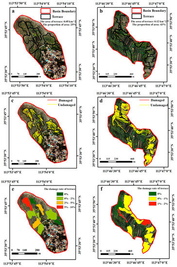 The distribution of terraced in XQ and LY watershed; (a) The distribution of terraces in XQ watershed; (b) The distribution of terraces in LY watershed; (c) The damage distribution of terraces in XQ watershed; (d) The damage distribution of terraces in LY watershed; (e) The damage rate of terraces in XQ watershed and (f) The damage rate of terraces in LY watershed.