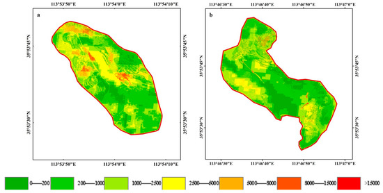 Spatial distribution of soil erosion modulus: (a) XQ watershed and (b) LY watershed.
