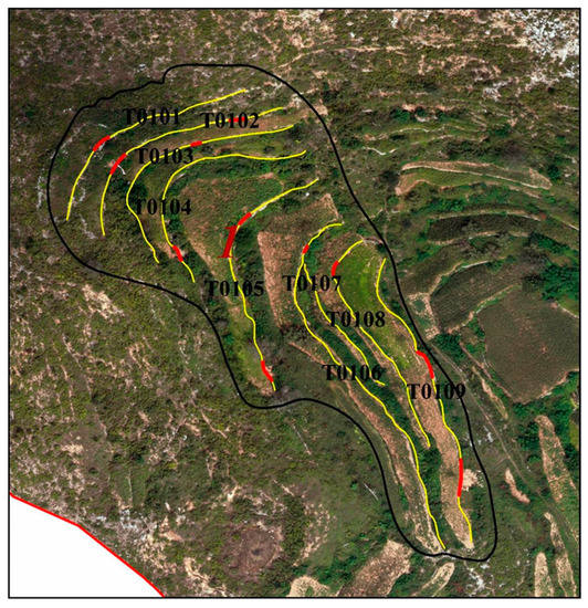 This study investigated the structural damage to soil and water conservation measures by UAV remote sensing image and manual field measurement. Taking the No. 1 block in XQ watershed as an example, the UAV images of the damage of terrace ridges were compared with the field investigation results (Figure 6 and Table 3). There were 9 terraces in block 1 of XQ watershed, and the length of terrace was 687m in total through UVA image. Among them, the length of damaged terrace was 58.1m, and the damage rate is 8.5%. According to field investigation and statistics, the terrace had a total length of 695 m, of which the damaged terrace had a total length of 46.4 m, with a damage rate of 6.7%. Therefore, UVA images overestimate terrace damage to a certain extent, but the spatial pattern of damaged locations was basically consistent with that of the field, and the main damaged locations were T0105 and T0109 terraces. The results showed that although there was some error in the UAV remote sensing image compared with the manual field measurement, the overall error was not large, which was suitable for soil erosion investigation in small watershed. This conclusion was the same as that of many scholars [48,49,50,51]. Therefore, field investigation combined with UAV monitoring was adopted to assess soil erosion under extreme precipitation.