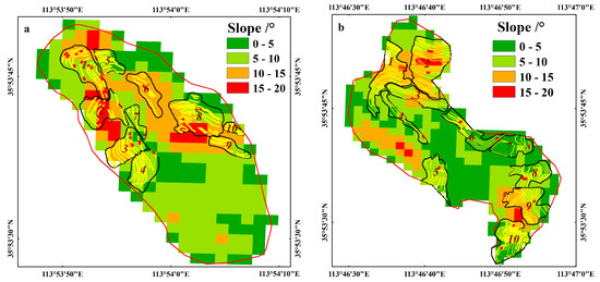 The distribution of terrace’s slope: (a) Spatial distribution of slope in XQ watershed and (b) Spatial distribution of slope in LY watershed.