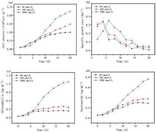 Effects of different iron concentrations on the growth of Microcystis aeruginosa. (a) Cell density; (b) specific growth rate; (c) chlorophyll-a; (d) carotenoids.