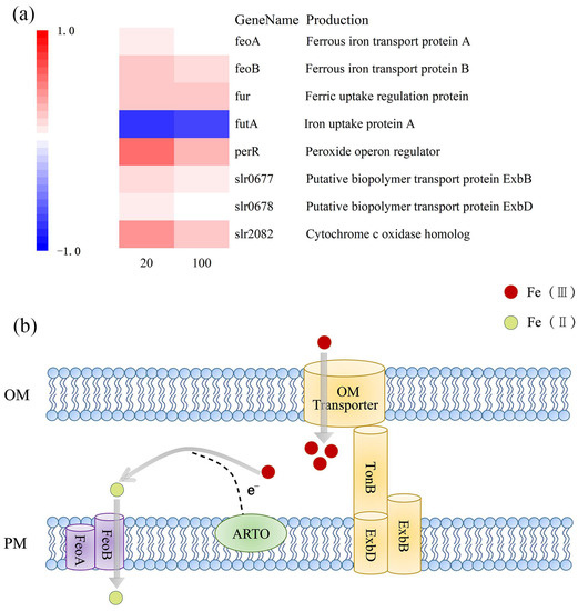(a) Heat map of genes related to iron absorption and transport. Blue corresponds to a decrease in transcript abundance, and red corresponds to an increase in transcript abundance. White means no difference from the control condition; (b) schematic diagram of the iron absorption pathway. Fe(III) is first transported through the outer membrane (OM) of the cell (yellow), the respiratory terminal oxidase, ARTO (green), is involved in Fe(III) reduction before transport through the plasma membrane (PM). Fe(II) is transported through FeoB (purple).