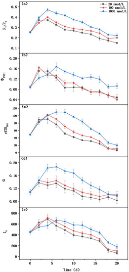 M. aeruginosa cells were collected every two days to determine the chlorophyll fluorescence. After dark adapting the samples for 20 min, the Rapid Light Response Curve (RLC) was measured using the Phytopam Phytoplankton Fluorescence Spectrometer (Walz, Germany) to obtain the maximum chlorophyll fluorescence yield (Fm) and the minimum chlorophyll fluorescence yield (Fo) of the samples after dark adaptation [25]. Fm − Fo = Fv, Fv represents the maximum variable fluorescence, and thus the maximum photochemical efficiency (Fv/Fm) of PSII is obtained [26]. A total of nine photosynthetically active radiation (PAR) values were measured by fluorimetry, which were 34, 110, 161, 248, 366, 559, 833, 1181, 1627 μmol photons·m−2·s−1. The potential maximum relative electron transfer rate (rETRmax) and the initial slope (α) of the fast light curve were obtained by fitting the RLC.