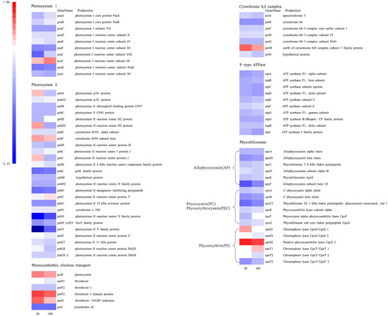 In an iron-deficient environment, the phycobilisome nuclear protein gene (apcF) and the phycocyanin connexin gene (cpcC) were significantly down-regulated in the phycobilisomes (PBS) of cyanobacteria. Similarly, other genes related to phycocyanin and allophycocyanin, such as allophycocyanin subunit genes (apcA and apcB), phycobilisome rod nuclear connexin (apcC), phycobilisome anchoring protein genes (cpcF), allophycocyanin connexin gene (apcL), phycocyanin subunit genes (cpcA and cpcB), phycocyanin subunit phycocyaninase (cpcE), rod and nuclear connexin gene (cpcG), etc. [42,43], were all down-regulated. This is because the synthesis of phycocyanin and phycoerythrin requires the participation of ferredoxin, and the synthesis of phycobiliprotein chromophore also requires the participation of heme oxygenase. When algal cells are under low-iron stress, most of the genes related to PBS are down-regulated, resulting in a decrease in the PBS content.