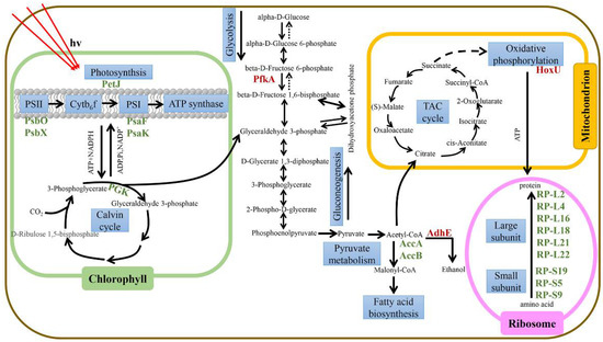Schematic diagram of cellular metabolic pathways derived from transcriptome analysis of Microcystis aeruginosa under iron limitation. The arrows represent biochemical pathways. Black font indicates metabolites. The red and green bold names indicate gene expression that is up- or down-regulated in response to iron limitation.