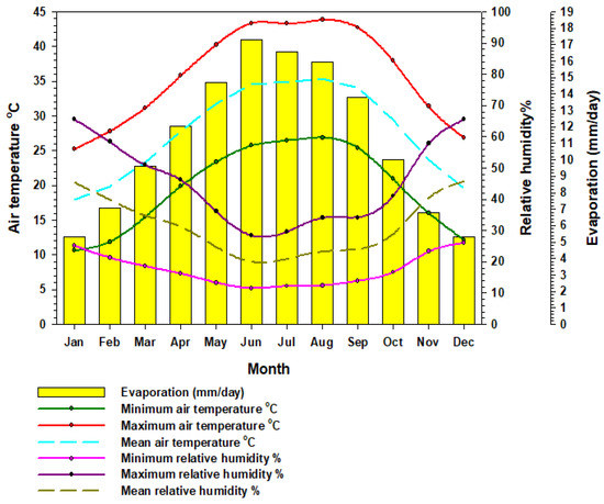 Evaporation is an important meteorological parameter for determination of the initial water losses, especially from surface water. Evaporation is controlled by many other meteorological elements, such as air temperature, relative humidity, solar radiation, and wind speeds. Generally, the evaporation rate is high in the Kingdom of Saudi Arabia due to the arid conditions, and in the study province, it ranges from 5.33 mm/day in December and January to 17.3 mm/day in June, as shown in Figure 2.