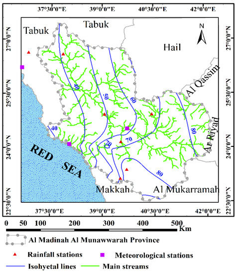 The study province of Al Madinah Al Munawarah, is located in a hyper-arid to arid zone. Several factors control the rainfall intensity in the study area, including topographic conditions, air temperatures, and atmospheric pressures. The authors of [33,34] presented details of the systems which elaborate upon the water harnessing efficiency from wadis through distinctive physical methods, field case studies, sample interpretations, and various applications to different models.