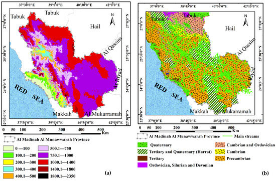 Digital elevation model (DEM) (a) and geological map (b) of Al Madinah Al Munawarah Province.
