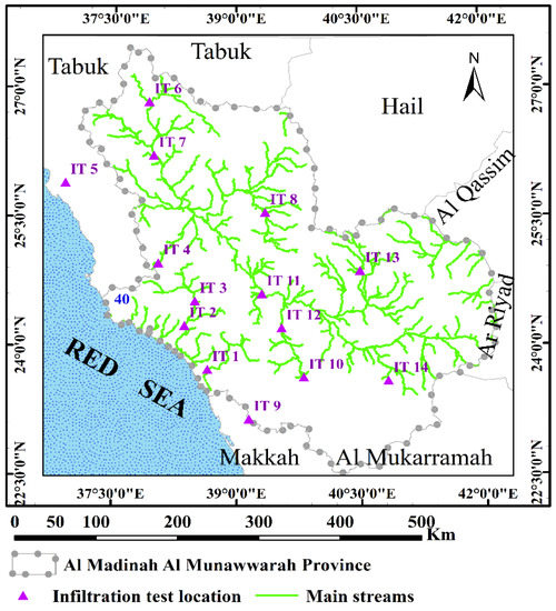 The locations of the infiltration tests in this study are displayed in Figure 5. They covered Al Madinah Al Munawarah Province as shown in the figure. The locations of these tests were mainly in the alluvium, the ephemeral streams that help in understanding the infiltration characteristics for flash floods and consequently the transmission losses. Figure 6 shows the field measurements of the 14 tests in the study area. The figure shows high variability in the infiltration behavior that will be discussed in the following sections.