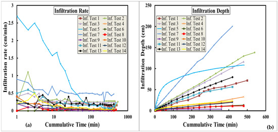 Field-measured infiltration tests: infiltration rates (a) and cumulative infiltration depths (b) versus time.