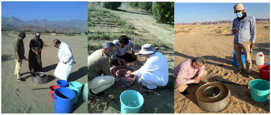 The infiltrometers were composed of two rings 25 and 50 cm in diameter, with a ruler scale implanted into the soil about 10 cm using calm shocks by hammering without any turbulences or fluctuations in the soil structures, as shown in Figure 7. A constant water level was kept inside the infiltrometer. The external ring played a crucial role in preventing horizontal water seepage from the inner ring, allowing cylindrical flow through the inner ring. The infiltration test continued by water percolating into the soil over time, recording measurements until an approximate constant infiltration rate was reached.