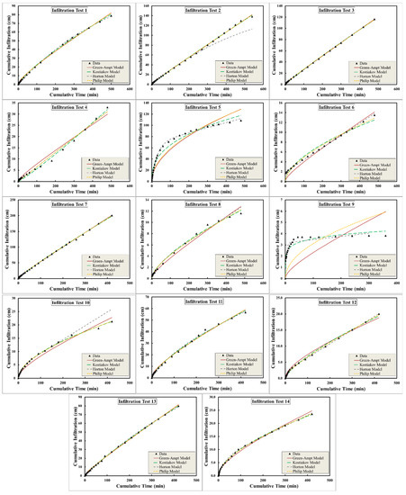 Famous infiltration models were used to fit the infiltration data, namely the Philip [39], Horton [11,12], Kostiakov [13], and Green and Ampt [10] models. The equations used for these models are given in the following subsection.