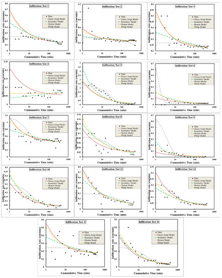 The overall results show that each test could be better presented by a specific model based on the maximum R and the minimum RMSE. The best fit could either be observed in f or F. The last column in Table 2 shows the best model for each test. The Kostiakov model seems to best fit most of the tests (7/14) (i.e., 50% of the tests), the Horton model represents 29%, the Philip model represents 14% and the Green–Ampt model represents 7%.