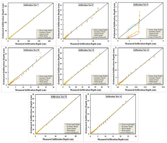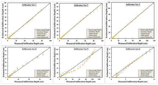 Field-measured cumulative infiltration depth versus modeled cumulative infiltration depth with the various models.