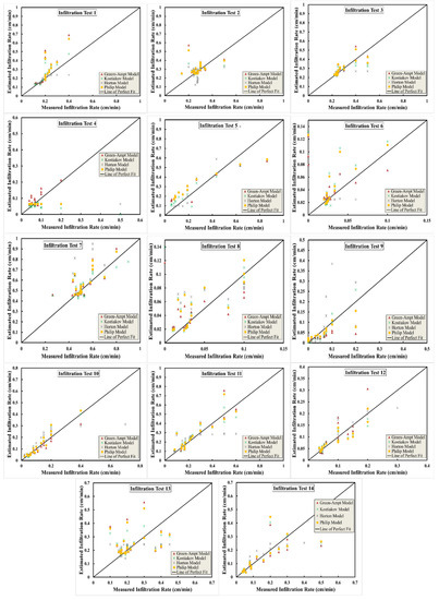 For the Kostiakov model, R varied between −0.34 (Test 4) and 0.96 (Test 10) with CV = 0.63 for f. The majority of the tests showed high correlation, except for Test 4, which showed low and negative correlation similar to Philip’s model, as mentioned in the above paragraph (see Figure 10, Test 4). For F, R varied between 0.96 (Test 9) and 1 (Tests 3 and 14) with CV = 0.01, which showed very low variability. The RMSE varied between 0.02 (Test 12) and 0.46 cm/min (Test 5) for f with CV = 1.17, showing high variability. Meanwhile, for F, the RMSE varied between 0.22 cm (Test 14) and 6.37 cm (Test 5) with CV = 1.35, showing high variability. The overall results of the Kostiakov model had great similarities with the Philip model in terms of R and RMSE. Although they are from different backgrounds, the first is an empirical model, while the last is a physically based model.