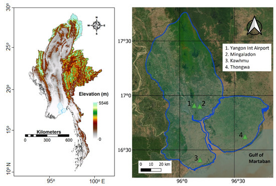 Climatologically, Myanmar is located in the Southeast Asian monsoon-dominated region. Therefore, nearly 70% of its total rainfall is received in the monsoon season (June to September) [27]. There is a large spatial variability in rainfall. Satyanarayana et al. [28] assessed the spatial variability of Myanmar’s rainfall and showed higher rainfall in the southwest coastal region, including Yangon. Inter-annual variability of monsoon rainfall is also high [29]. The large spatiotemporal rainfall variability has made the country, particularly the southwest coastal region, including Yangon, highly vulnerable to rainfall-driven natural hazards. The country ranked third for climatic hazards based on the global climate risk index (2018). Myanmar has experienced a change in rainfall regions due to climate change in recent years. Greater Yangon, situated in the southwest high rainfall deltaic region, is most vulnerable to such changes [11].