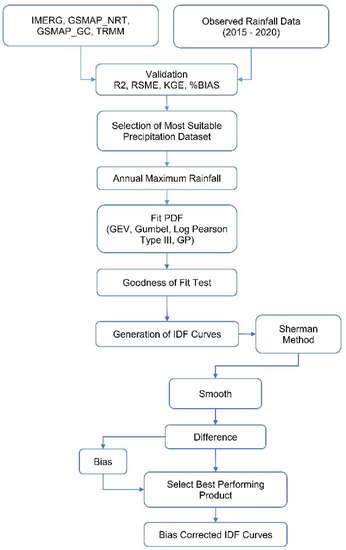 The main objective of this study is to develop IDF curves at ungauged locations of Yangon using satellite-based rainfall data. The detail of the procedure used for this purpose is shown using a flowchart in Figure 2. The following steps were used to achieve the objective.