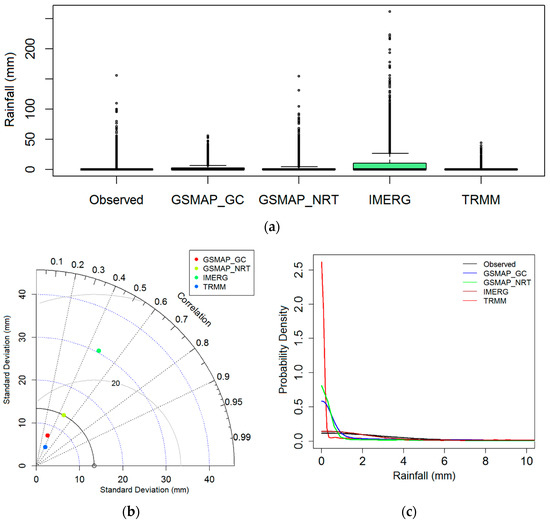 (a) Box plot; (b) Taylor diagram; (c) density plot of observed and satellite daily rainfall during 2015–2018.
