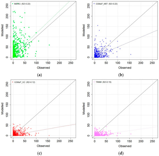 Scatter plots of satellite-based daily precipitation datasets of (a) IMERG; (b) GSMaP_NRT; (c) GSMaP_GC; and (d) TRMM compared to observation.
