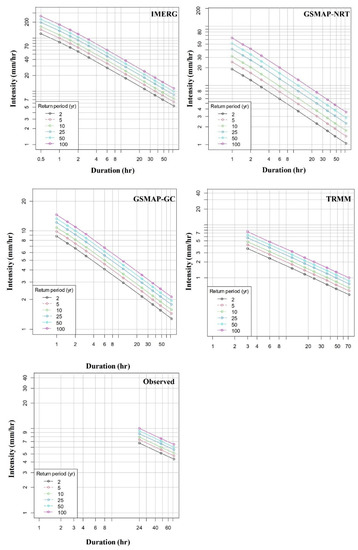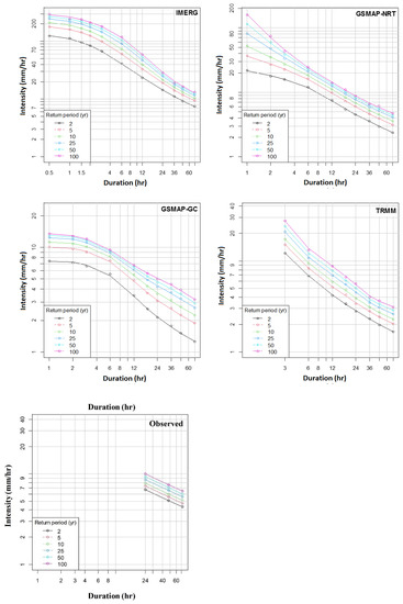 Sub-hourly or hourly rainfall data are not available at YIA or any other locations in Myanmar. Therefore, it was not possible to validate the satellite IDF curves. Therefore, the present study evaluated the performance of satellite IDF curves based on return periods of observed 24, 48, and 72 h rainfall intensities. The results showed that all the products severely underestimated the observed daily IDF curve at YIA, except IMERG. For example, the observed 2-year return period rainfall for 24, 48, and 72 h durations were 19.1, 13.2, and 10.5 mm/h, respectively. The GSMaP_NRT estimated those intensities as 4.5, 3.7, and 2.9 mm/h only. The TRMM and GSMaP_GC underestimated those values more than GSMaP_NRT. In contrast, IMERG provided the most realistic result. It slightly underestimated those rainfall intensities and estimated them as 16.1, 11.3, and 8.1 mm/h. Overall, the results revealed that the underestimations of observed IDFs for different return periods by IMERG were 19.5 to 29.1%, while those were more than 300% for all other satellite rainfall products.