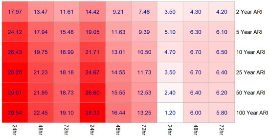 The observed and satellite IDF curves generated based on the Sherman equation are presented in Figure 6. The percentage difference between the fitted IDF and the Sherman method at Yangon International Airport (YIA) for IMERG is summarized using a heatmap in Figure 7. The results indicate IMERG has the least difference with observation than the other datasets. The white color in the map represents less difference while the red color represents a high difference. Overall, the higher differences were for 1.5 h to 6 h duration rainfall events. The difference was also generally high for higher return periods. The minimum difference of 2.4% was observed for the 2-year return period 0.5 h storm duration, whereas the maximum was 51.1% for the 25-year return period 3 h duration storm event.