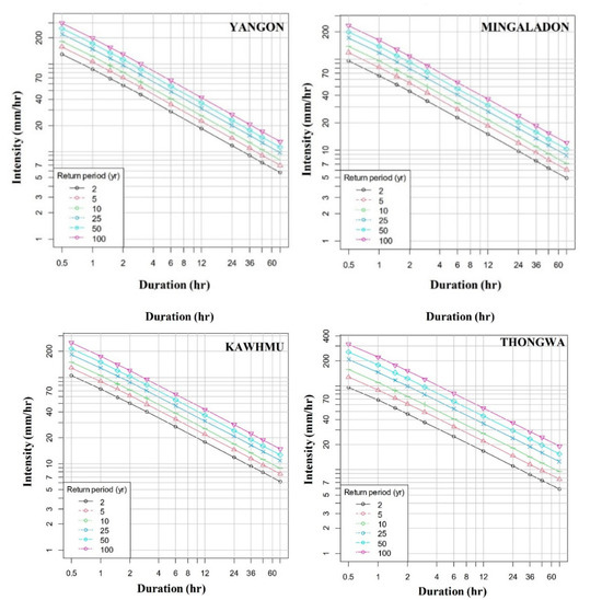 The Framework for Economic and Social Reforms (FESR, 2013) of the Myanmar government emphasized the need for sustainable urbanization [12]. Therefore, the National Urban Policy of Myanmar has aimed to implement adequate urban infrastructure [13]. The National Comprehensive Development Plan 2011–2031 (NCDP) of Myanmar has provided related guidelines in this regard. The country also recognized environmental and climate change issues as the major priority action for sustainable urban development [14]. The development of climate-resilient hydraulic structures is essential for sustainable urban development. Understanding extreme rainfall characteristics or the relation of rainfall intensity–duration–frequency (IDF) is vital for this purpose [15,16]. Defining hydrologic design standards of urban drainage systems based on IDF can mitigate urban flooding due to rainfall extremes and help in sustainable urban development.