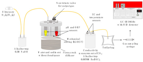 Respiration experiments were set up in four reactors (Table 3) with characterized water and sediment, not allowing gaseous headspace in order to assure that the emitted GHCG were released into the gas-trapping systems. Reactors were maintained in the dark with a blackout cover and water was slowly agitated with a mechanical paddle stirrer (RCF = 0.3 g) just above the water-sediment interface to allow mixing of the aqueous phase without resuspension of sediment. Four-hole stainless steel lids connected tubing for gas applications to porous rock diffusers located in the bottom of the reactors, allowing the release of gases trapped in sediments. Non-return valves allowed the GHCGs to be released from the gas-trapping systems. Half-hourly monitoring and automatic data storage of Eh and pH were carried out (Hanna model 1005 and 2001 sensors, Figure 2), and distributions of Eh and pH values were analyzed using the statistical software InfoStat [62], eliminating the outliers beyond ±2 standard deviations (σ), and determining the resulting median (μ), and σ.