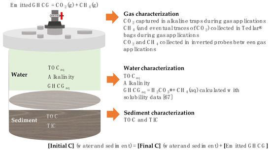 Carbon mass balances were determined with results from each reactor for quality control purposes and for experimental error estimation, by comparing final and initial masses in water, sediment, and emitted GHCG (Figure 3).