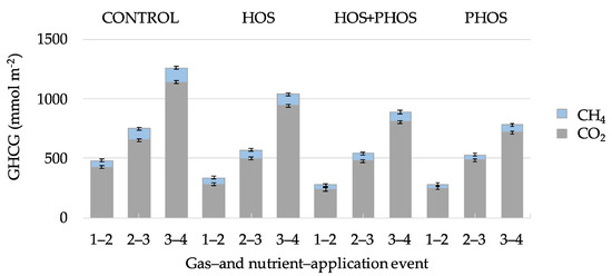 Generated GHCG may dissolve in aqueous phase where CO2 participates in the carbonate system, or be released as gases. Emitted GHCG varied between 782 ± 39 and 1262 ± 63 mmol m−2 during the experiments (Figure 4) and the following order was observed: CONTROL > HOS > HOS + PHOS > PHOS, with CO2 representing 90 ± 5%, and CH4, 10 ± 5% of emitted gasses. In all reactors with application of eutrophication control methods, released CO2 and CH4 were lower than the CONTROL reactor, in which no treatment was applied. Total GHCG emissions from one gas- and nutrient-application event to another (Figure 5) showed that as for the analysis of individual GHCG, the following order: was observed: CONTROL > HOS > HOS + PHOS > PHOS.