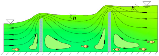 Pool and weir fishways, lot fishways, overflow weir fishways, submerged orifice fishways, and vertical slot fishways can provide safe environments for fish to both travel backward and rest [14,29,30], which is one of the reasons they are widely used. The design criteria for pool and weir fishways design are mostly based on salmonid swimming and behavioral characteristics and should be adapted to different local species for optimal performance, see, e.g., Mallen-Cooper, M. and Brand, D.A., 2007 [31]. The overflow weir fishway is equipped with multiple weirs, and the flow evolves in multiple water drops to reduce its stage, which contributes to maintaining a continuous water surface and adapting to the migration of fish with strong swimming ability. The submerged orifice fishway is suitable for fish migration in the middle and lower layers of channels; however, these fishes must pass through multiple orifices to reach the upper reach of the fishway [32,33,34]. In addition to structural fishways, new methods for piping fish upstream over dams were also proposed, as they are inferred to be able to offer a much higher lift than conventional fishways [35].