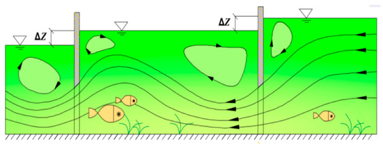 Therefore, for the purpose of supplying a comfortable migration route for fish, the hydraulics, fish swimming capacity, physiological limits, and ecological, environmental conditions in the rest pools, inlets, and outlets of fishways are all key elements of fishway design [8,18]. In order to adapt to fish migration in various river hydraulic conditions, many types of fishways with various designs were built and classified as technical structures (pool-type, vertical slot, and Denil fishways, surface collector bypasses, pool and weir fishways, weir and orifice fishways, lateral-system fish ladders, mixed-system fish ladder, nature-like structures (nature-like bypass channels and fish ramps), and special-purpose structures (eel ladders, fish locks, and fish lifts) [10,18,19,20,21,22]. However, because local boundary conditions and hydraulics are complex, some fishway designs fail to provide an effective passage for a broad range of fish migration [23]. Among various emerging problematic issues, we list local large-flow velocity, intense turbulent vortices, sharp water-level drops [24,25], and ignoring the different migrating habits of fish at different life stages [26,27]. For example, there is only weir overflow in the conventional pools and weir fishways, which is detrimental to the movement of benthic fishes [28]. All of these problems indicate that fishways can be characterized by different levels of eco-friendliness to fish.