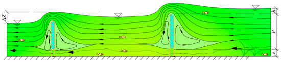 The orifice outflow is the bottom flow, and the typical orifice flow patterns of the two stages are shown in Figure 2. Multistage orifices are also usually adopted in channels or fishways to connect the water head drop caused by a dam. Under submerged outflow conditions, the streamline distribution in front of the orifice contracts, and the flow velocity increases gradually. The water head in front of the orifice is attributed to the size and position of the orifice. Downstream of the orifice, affected by inertia, a contraction section forms at about 0.5D to 1.0D away from the orifice, where D denotes the bore diameter. Then, the distribution of the streamlines begins to expand again, and the velocity of the orifice decreases gradually downstream. There is continuous bottom flow formed in the multistage orifice outflow, in which the streamline distribution contracts, expands, and contracts again, alternately. Downstream, away from the orifice outflow reach, the water depth increases, and the velocity decreases gradually, which supplies a suitable environment for fish habitation and the growth of aquatic organisms. As the orifice velocity is attributed to the water depth in front of the weir, the water depth of the fishway should not be so high that it prevents fish from passing because of the high orifice velocity. Therefore, the size and velocity of the orifice are critical parameters that affect fish migration [44,45,46,47,48].