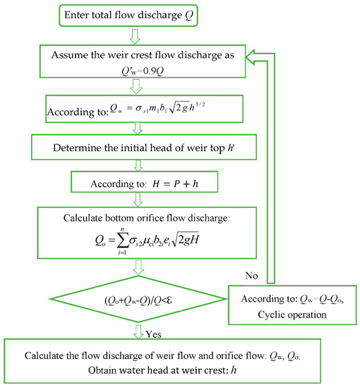 - We checked whether the sum of Q′w and Q′o followed the mass conservation principle, i.e., Equation (4). If the error was less than the error limit ε, which usually takes the value of 0.001, then the Q′w and Q′o were obtained. Otherwise, if the error was larger than ε, we set the weir flow discharge as Q″w=Q − Q′o, and repeated Steps (ii), (iii), and (iv) until the error met the requirement. The calculation process is shown in Figure 4.