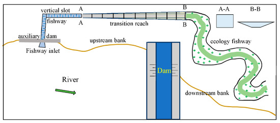 To supply a passageway for fish migration in the river that is cutoff by a dam, the fishway project would be built on the left bank of the river. To adapt to various water-level conditions of the river, two fishways with two inlets in different locations were designed in the project, only one of which was considered in this study, as shown in Figure 5. The fishway consists of three reaches. The first reach is the vertical slot fishway with a rectangular cross-section of 5 m (width) × 3.5 m (depth) that starts from the dam upstream. The third reach is the ecological fishway downstream of the dam, with a meandering channel of over 1300 m long, which was designed to imitate a natural river.
