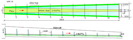 The middle reach that connects the vertical slot fishway and ecological fishway is the transition reach. It was designed as a non-prismatic channel, the inlet of which has a rectangular section similar to the vertical slot fishway, while the outlet has a trapezoid cross-section similar to the ecological fishway. Therefore, the sidewall of the channel was designed as a twisted surface, and the bottom slope is 6.7‰ in the transition reach. In the channel, the depth and the bottom width decrease along the channel, while the sidewall slope and top width of the channel both increase correspondingly. In the outlet, the depth of the channel is only 1.5 m, and the bottom width decreases from 5.0 to 1.5 m, while the side slope is up to 1/3. The total water head drop of the transition reach was designed to be 2.5 m so as to connect the two types of fishway, i.e., the vertical slot fishway and the ecological fishway. In order to eliminate the steep hydraulic slope, 11 stages of submerged weir plates at equal distances were designed in the transition reach, where the heights of the weir plates decreased from 2.5 to 0.3 m. The multistage weir plates play a role in reducing the local head drop of each weir significantly, i.e., the water depth difference before and after the weir decreases significantly, making the flow more tranquil according to the design. The transition reach is 100 m long, and the layout is shown in Figure 6.