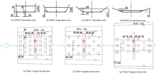 Sketch of DWO and roughness boulders (unit: cm). The elevation view of the DWO 1, 4, 7 and 11 are shown in panels (a–d), which includes three orifices in each weir plate. The DWO structure can be divided into three typical regions (including three weirs), as shown in (e–g). The roughening blocks are arranged symmetrically with the central axis of the channel, and the blocks upstream and downstream from the orifice are also arranged symmetrically. The roughening boulders were sampled as cubic blocks in the hydraulic model, as shown in the figure.