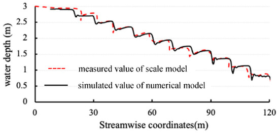 - Verification of the modeling: in order to ensure the accuracy of the numerical simulation, the numerical model of the fishway was validated based on the data of Case S1. The simulation results of the water surface line were compared with the test results of Case S1 obtained from the hydraulic scale model built before numerical simulation, as shown in Figure 10. It is indicated that the general trend of the water surface line of the simulated data was consistent with that of the experimental data to a large extent; both maintained almost the same drop at each stage (of about 0.4 m), and they had the same energy slope. The proper roughness of the channel was selected by adjusting the resistance parameter, i.e., improving the bottom boundary conditions by establishing roughness boulders (Figure 8 and Figure 9). Finally, the value of the Manning roughness was about 0.03.