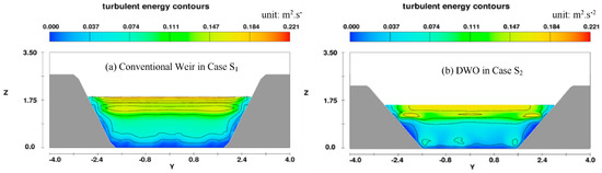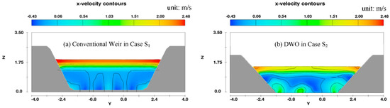 By analyzing the changes in the local streamlines in front of and behind the DWO plate in Figure 18, it can be seen that the streamlines were relatively concentrated in the upper and lower flow layers in the flow field. The weir crest overflow leading to the streamline distribution near the weir crest presented a trend that contracted upward firstly in front of the weir and then expanded gently behind the weir. The orifice flow caused the streamline distribution near the bottom to contract downward firstly in front of the orifice and then expand upward after passing the orifice. There was a large region of frictional transverse circumfluence in the weir pool. As the velocity of the circumfluence region is less, the flow structure is suitable for fish to rest. The stable and tranquil flow in the DWO means a lot to the security of both the building and the migrating fish. Moreover, the continuous complete water surface without exposure to any artificial buildings provides a better imitation of the natural ecological environment for the migrating fish.