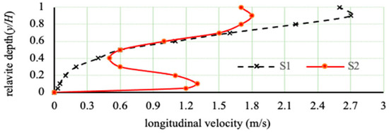 Under the boundary conditions of Case S1 with 11 conventional weirs, the measured velocity of the weir crest was generally at 1.74 to 2.85 m/s. However, as the DWO was adopted in Case S2, the maximum velocity of the weir crest in Case S2 was decreased by 31%, ranging from 1.5 to 1.85 m/s. The average velocity of the orifice flow in the bottom also could be controlled from 0.7 to 1.3 m/s, as shown in Figure 22. The reason for this is that the double-layer discharging flow, i.e., the overflow of the weir crest and the bottom flow pass through the orifice, increasing the kinetic energy dissipation and reducing the total flow intensity. The magnitude and the vertical profile distribution of the velocity from the experimental data are almost consistent with the numerical simulation results. The adjusted flow structure in the S2 scheme ensures that both the upper and lower flow layers in the DWO could behave better in meeting the requirements of migration.