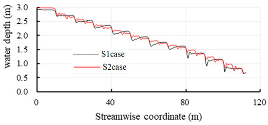 Comparison of water surface profiles between the two schemes. The water head drop in Case S1 ranges from 0.3 to 0.4 m, which is difficult for migrating fish. However, the flow drops in Case S2 have been reduced to 0.10 to 0.16 m, forming a minor undulating water surface, which is more suitable for fish migration.