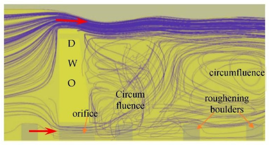 Streamlines through the DWO plate. The change in the streamline distributions around the roughening blocks at the bottom reflects their retardation effect and the adjustment to the bottom flow field. The streamlines show that there is still circumfluence between the two weirs.