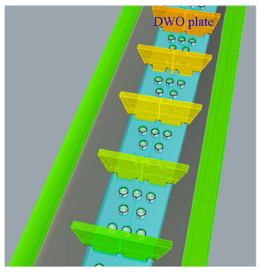 - Numerical simulation range and boundary conditions: the simulation range includes a short end reach of the vertical slot fishway (rectangular cross-section) of about 10 m, the whole transition reach (non-prismatic body) of about 100 m, and part of the ecological fishway (trapezoidal cross-section) of about 10 m as the outlet of the model. There were two boundary conditions (schemes) to simulate, Case S1 and Case S2. The S1 condition had multistage weirs (11 stages) without orifices, and the flow field was compared to that of Case S2. Case S2 had a multistage DWO (21 stages). The 3D shapes of the simulated channel boundaries and the DWO are shown in Figure 8 and Figure 9. The upstream open boundary conditions of the model were the water depth and flow rate. Here, the chosen flow condition not only had high intensity in practice but also met the boundary conditions of the upstream fishway, i.e., the discharge was about 3.6 m3/s, and the inlet water depth was 3.0 m, accordingly. The open boundary of the downstream fishway adopted a water depth of the outlet of about 0.75 m, determined by the inlet water depth of the ecological fishway with the broad and shallow channels. The wall boundary also fits the condition of no slip.