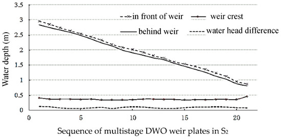 By adopting the differential weir–orifice structure (DWO), the bottom orifice flow caused the water head drop between every two weirs to be greatly reduced by 60% to 70% and evenly to only about 0.11 m, as shown in Figure 21.